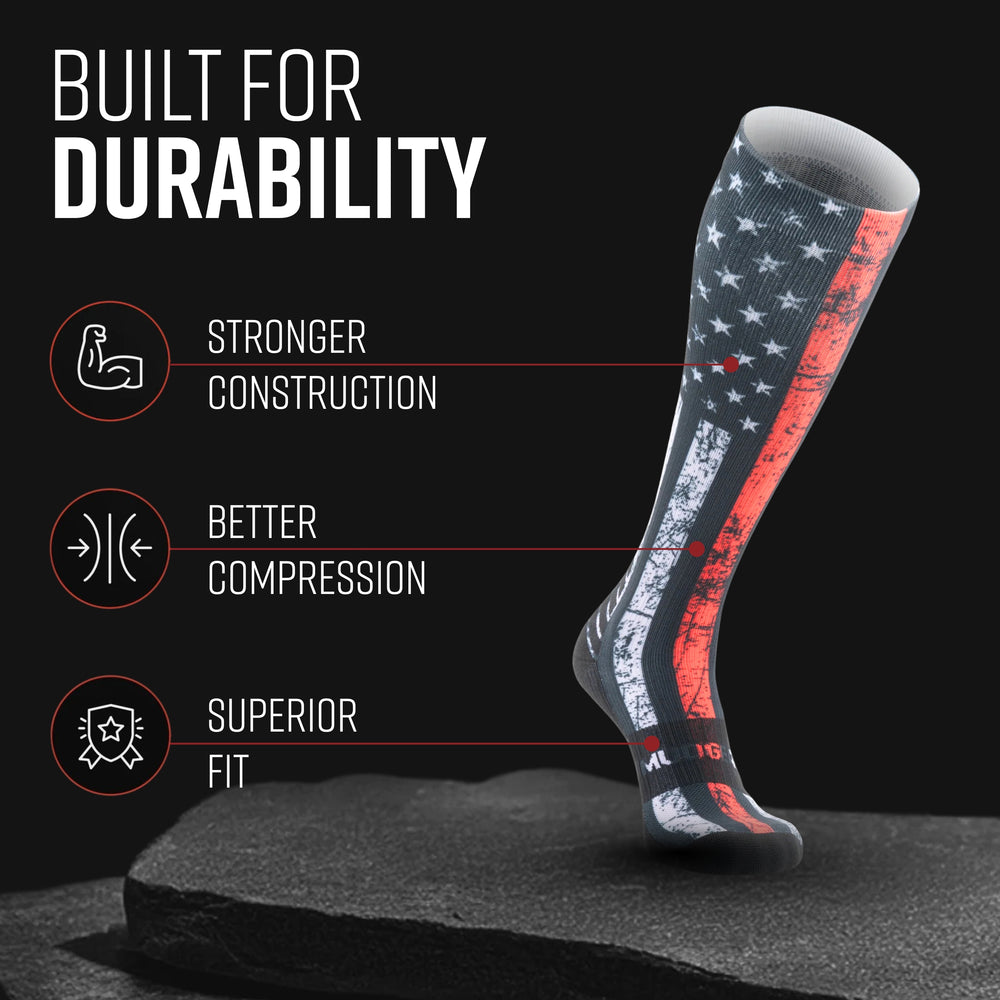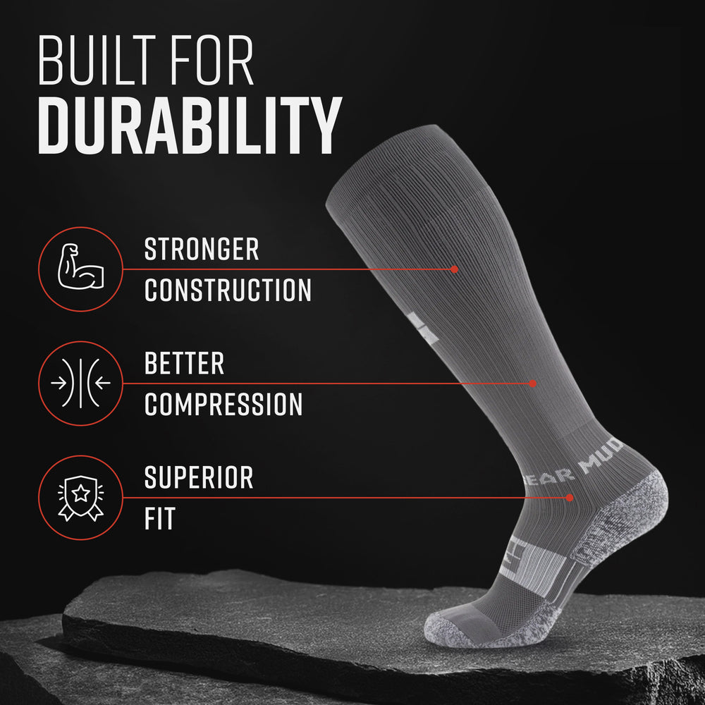 Compression socks are also what put MudGear on the map. We originally designed these over-the-calf running socks to withstand the harsh outdoor conditions of trail running and military-style obstacle course races like Spartan Race and Tough Mudder. Since then, MudGear originals have been accepted and praised as the highest-quality sock around. MudGear’s “Made Tougher” anatomy has become the gold standard for athletic compression socks throughout the United States. Runners report improved blood circulation, longer-lasting leg muscles, and faster recovery.