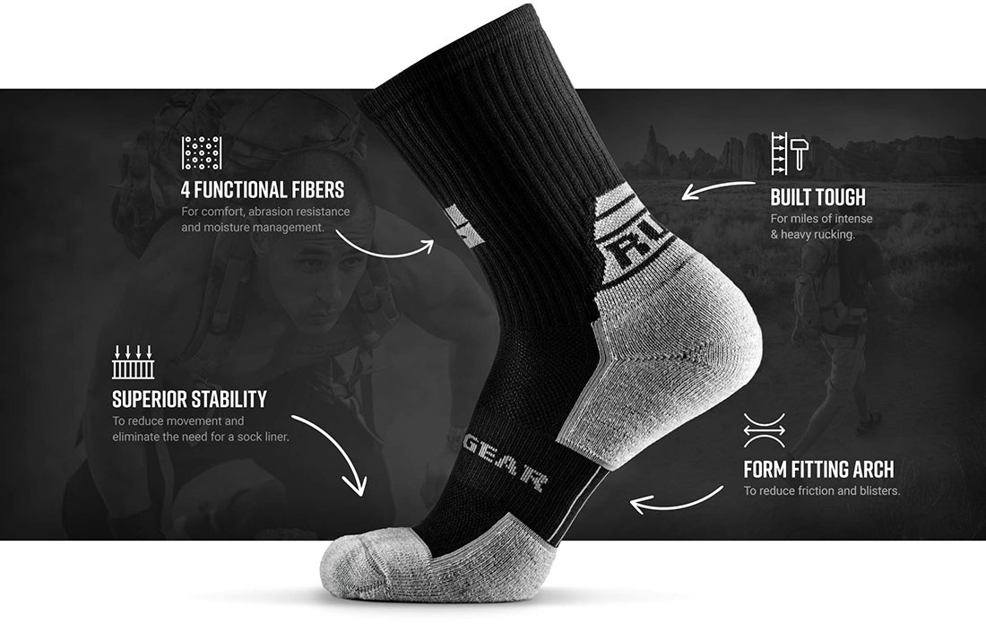 MudGear Ruck Socks are crew height and made with Merino Wool for lasting freshness and superior moisture management. They come in black, gray, military tan, and army green as a reminder that MudGear makes the best military socks for rucking.