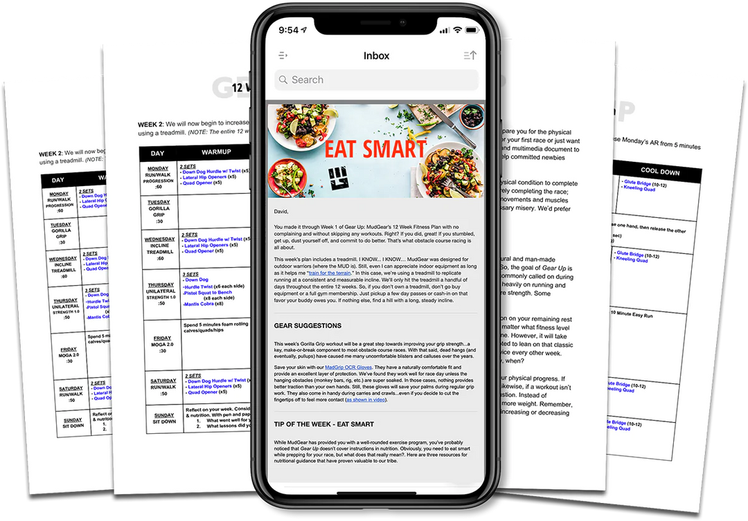 Gear Up:MudGear’s 12-Week Fitness Plan was designed to help new obstacle course racers develop the speed, endurance, and overall fitness required to crush a Tough Mudder. The plan encourages participants to begin their first week of training by running for 30 minutes or as long as you can without walking. When you must walk, do it for 1 minute; then, start running again. Repeat until you get to 30 minutes. Record distance and how you feel. Upon the last weeks of the 12-week plan, participants will repeat the run sequence (this time for 40 minutes) and note the improvements. Learn more about Gear Up! from MudGear.
